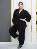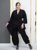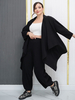 Лёгкий костюм для весны-лето из ткани на хлопковой основе бенгалин. Костюм состоит из кардигана и брюк. Кардиган свободного оригинального кроя, низ с перепадом длины. Рукава формы реглан. Брюки типа шароварчиков свободные к низу заужены. Пояс круговая резинка. Спереди под поясом карманы. Сзади накладные карманы. Длина кардигана спереди в центре 107см, по спинке 75см. Длина брюк 100см. Пояс входит в комплект.
