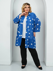 Нарядная двойка из шифона и масла. Верхняя туника выполнена из шифона в горох. Застёгивается на пуговицы. Рубашечный воротник стойка. Фасон туники расклешен. Топ выполнен из корейского холодного масла, ткань очень хорошо тянется. Длина туники 100см, топ 80см.