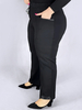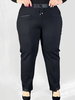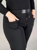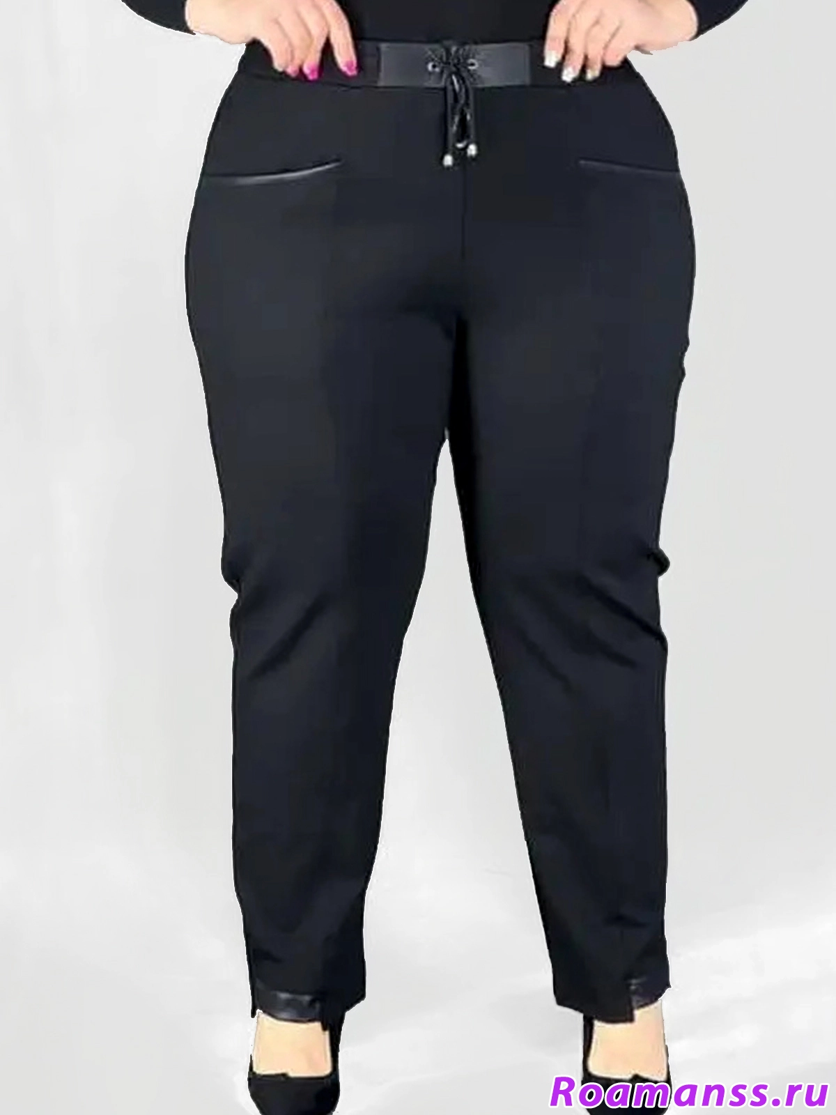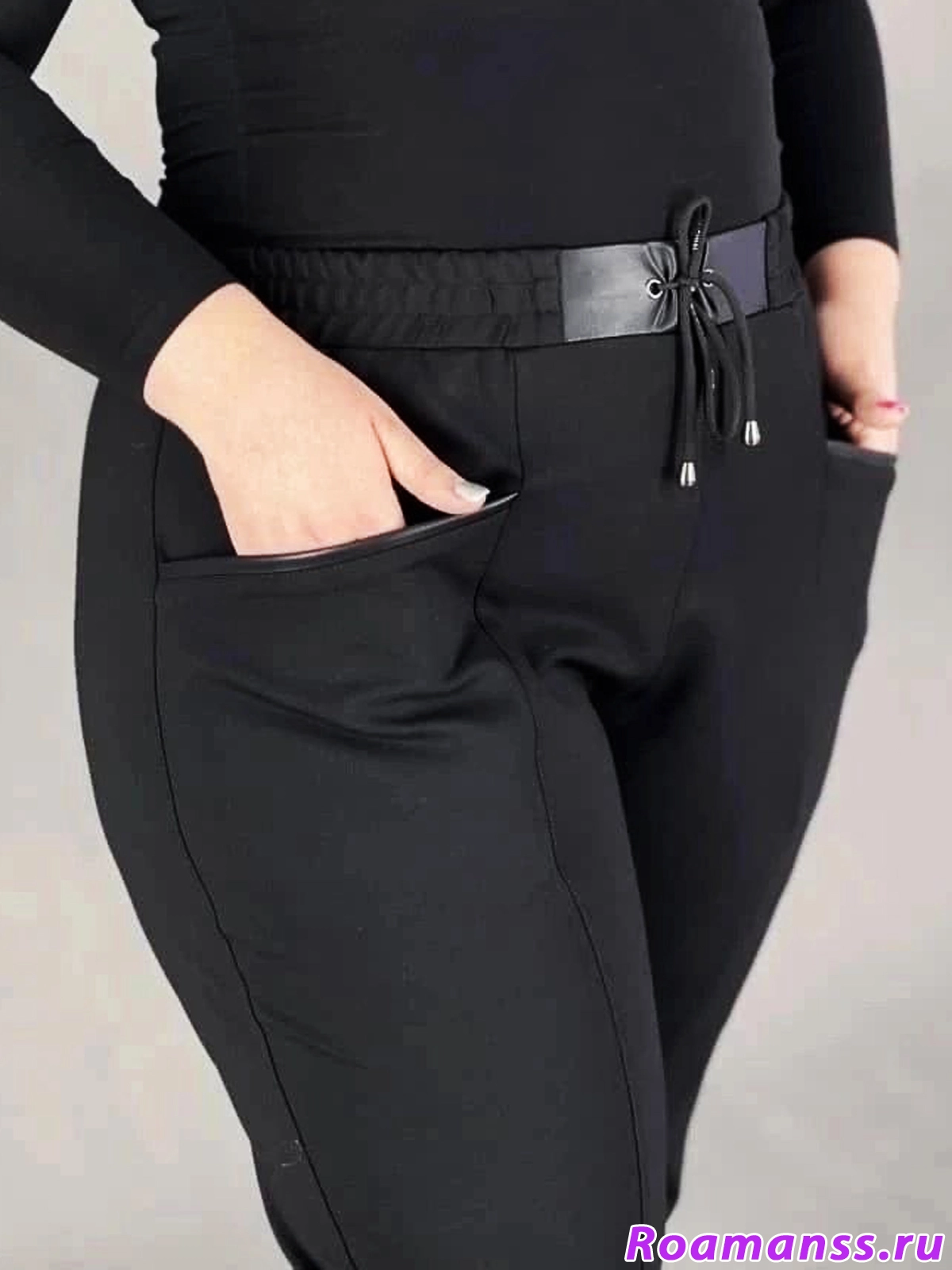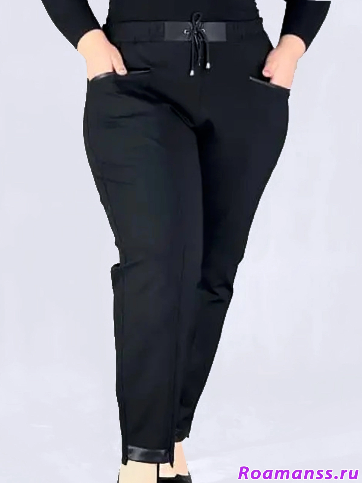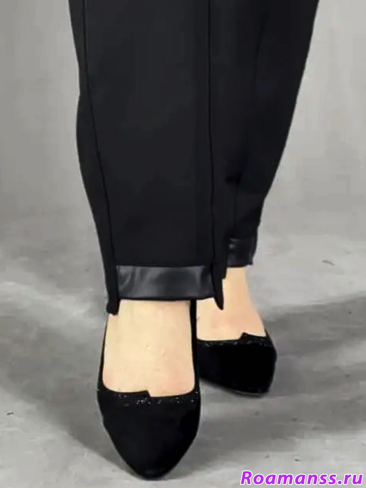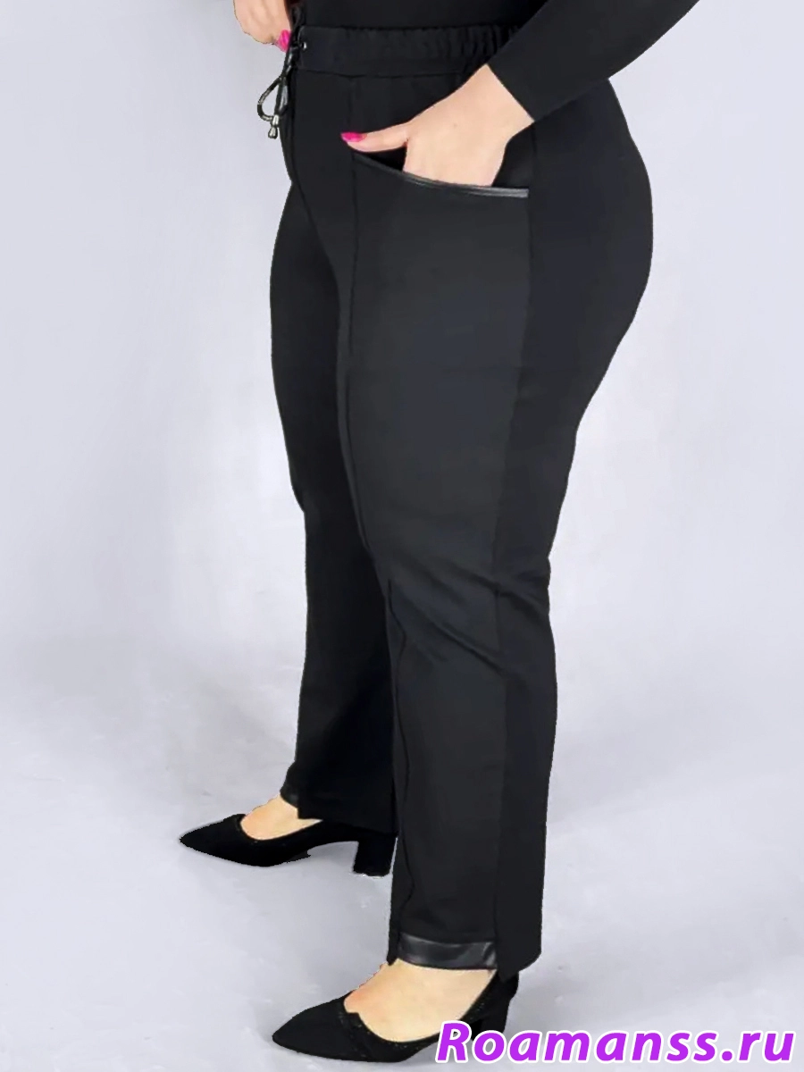 Брюки из плотного трикотажа нейлон. Фасон облегающий, заужен к низу. Вдоль ноги стрелочка строчка. Пояс круговая резинка. Спереди под поясом карманы. Брюки очень хорошо тянутся. Отделаны вставками из искусственной кожи. Длина 110см.