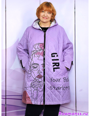 Удлинённая куртка с капюшоном на тонком синтепоне. Фасон слегка расклешен. Застёгивается на молнию. Спереди карманы. Украшена стильным принтом. Длина 100см.