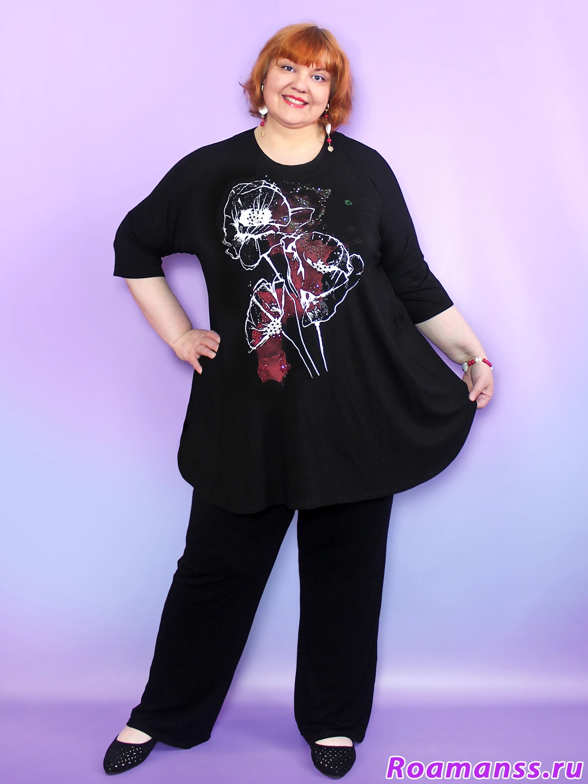 Эффектная туника большого размера. Фасон расклешен. Украшена красивым принтом, стразами и бусинами. Фасон прекрасно маскирует полноту. Ткань плотный турецкий вискозный трикотаж. Производство Турция. Длина 90см.