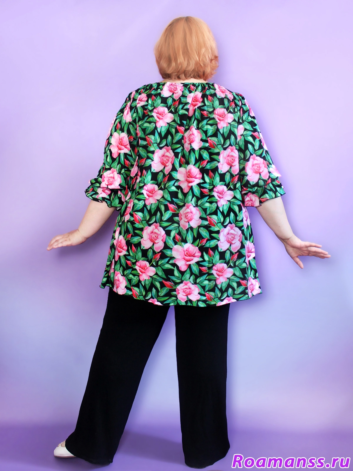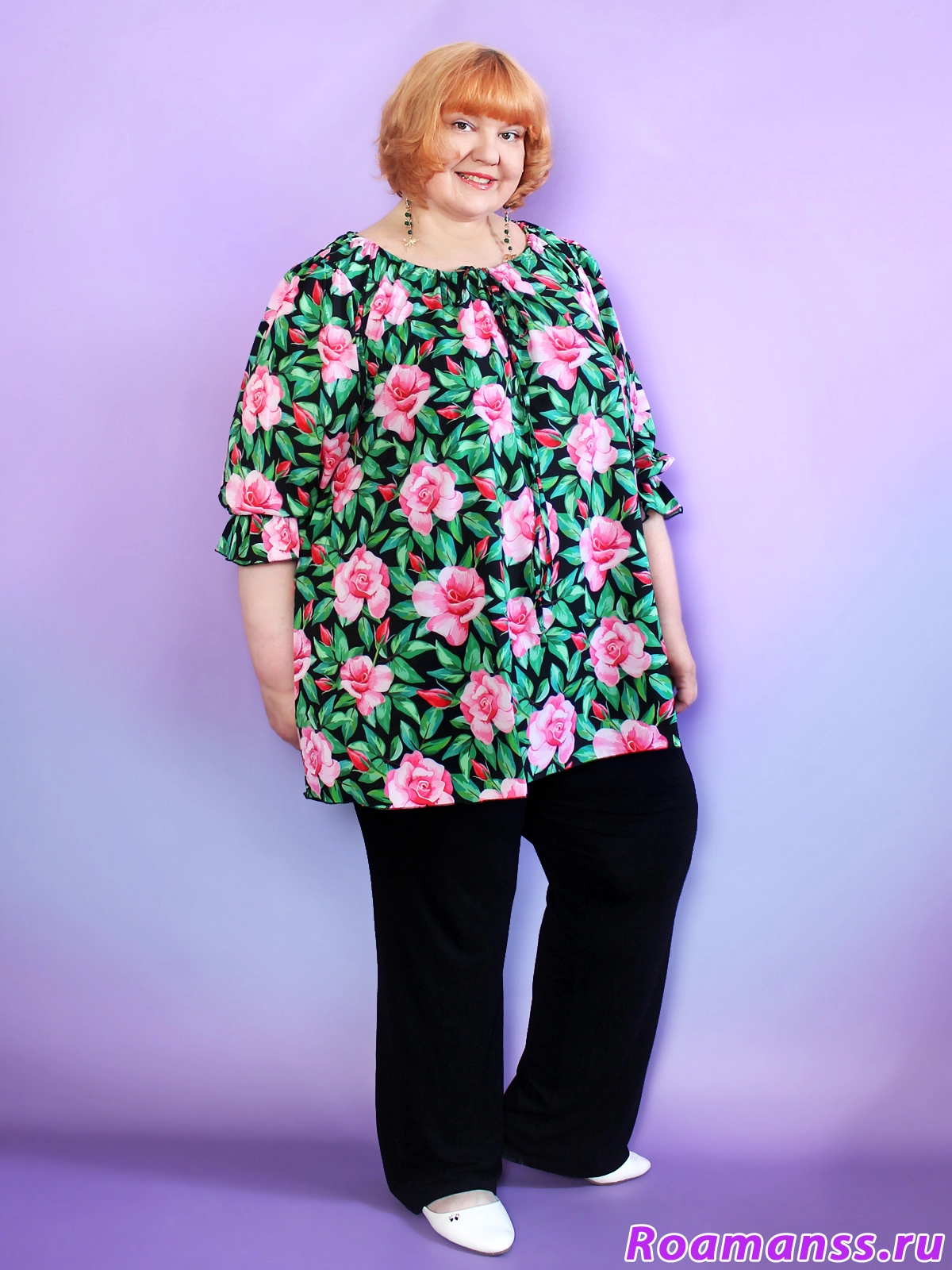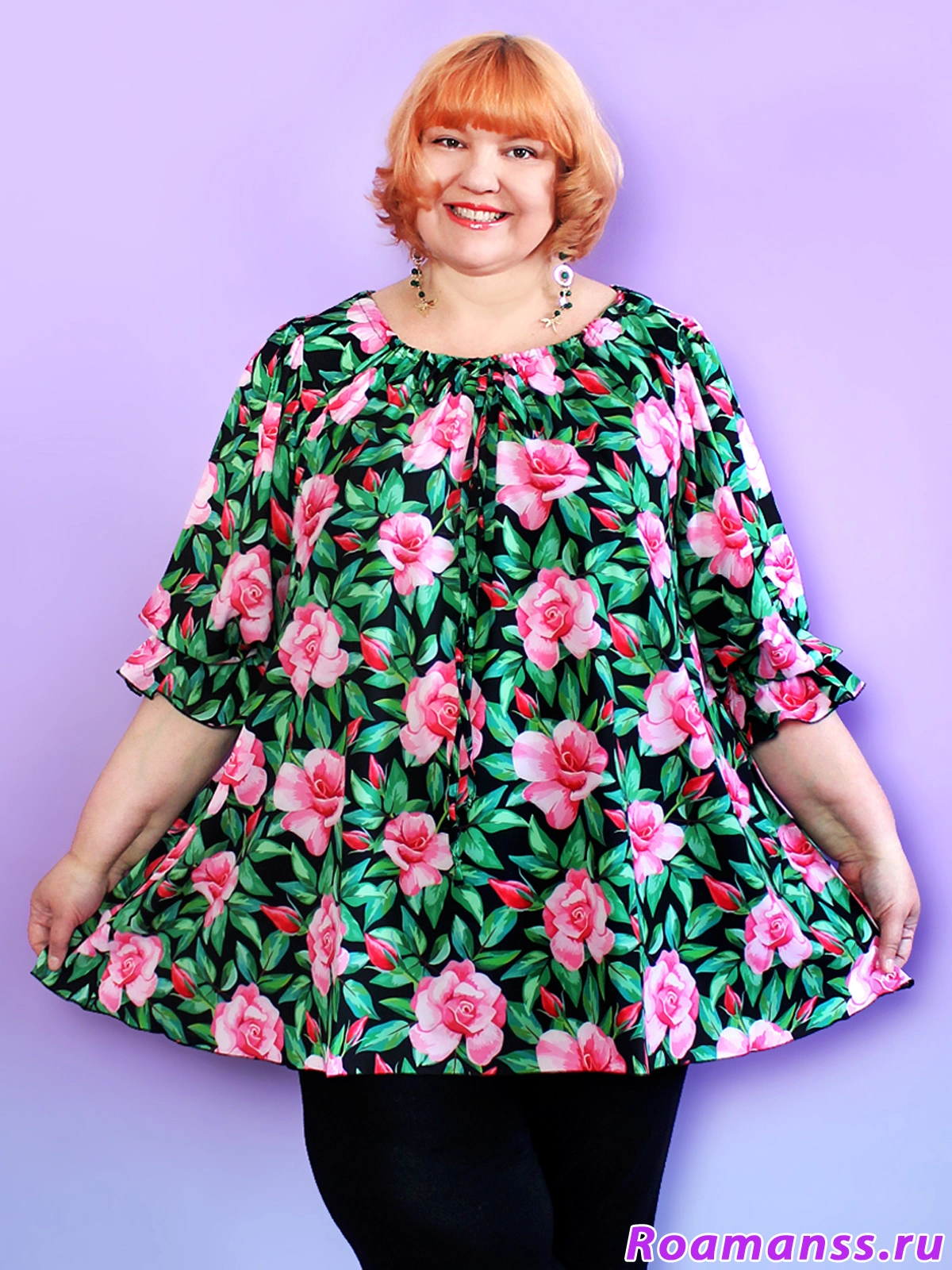 Летняя туника живописной расцветки для полных дам. Фасон расклешен. Вырез горловины присборён кулиской. Рукава втачные длиною три четверти. Присборены резинкой и украшены рюшками. Выполнена из шелковистой ткани Ниагара софт. В этой тунике Ваш образ будет лёгкий и романтичный. Длина 85см.