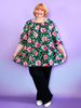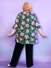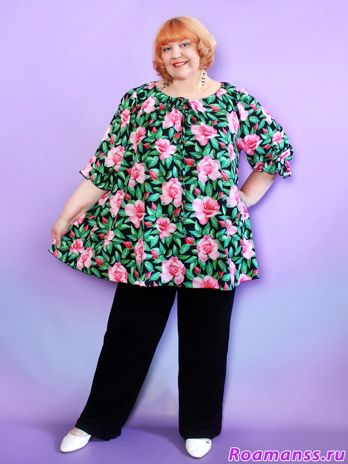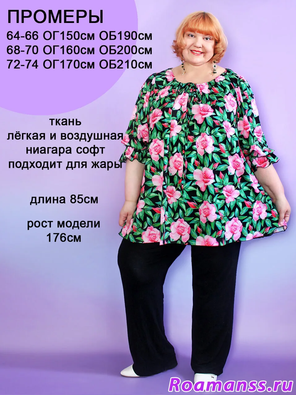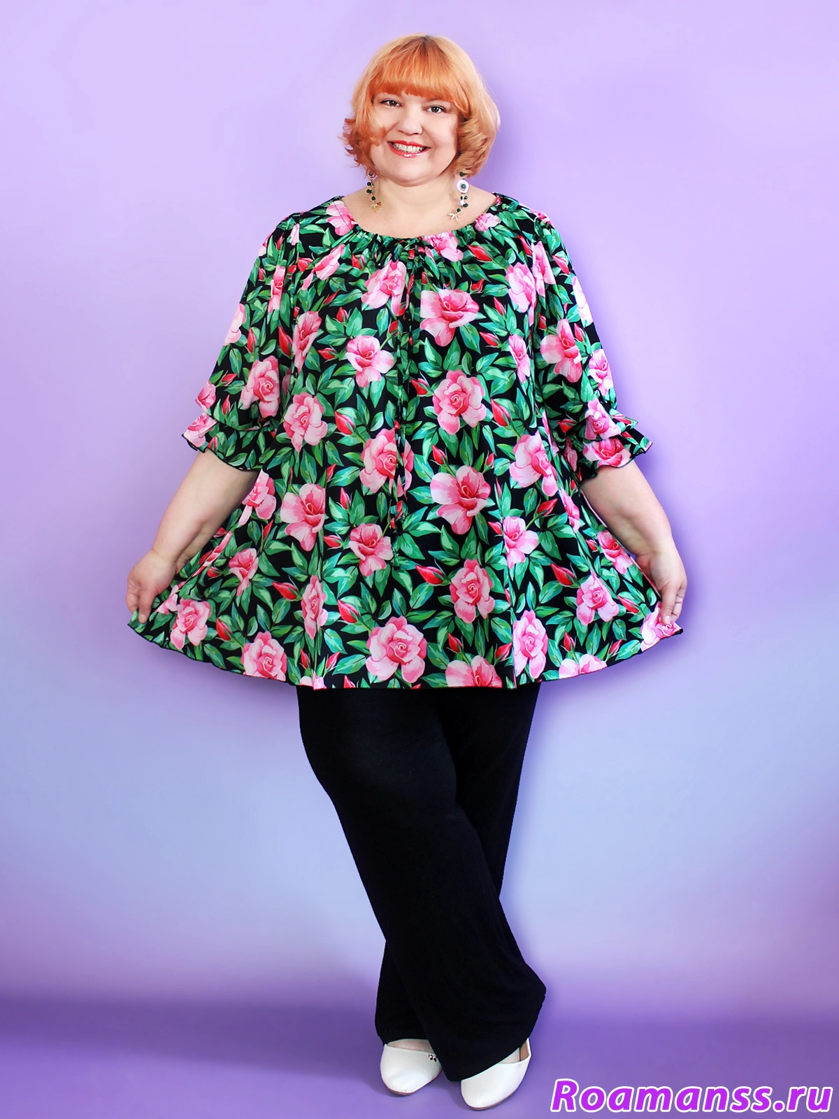 Летняя туника живописной расцветки для полных дам. Фасон расклешен. Вырез горловины присборён кулиской. Рукава втачные длиною три четверти. Присборены резинкой и украшены рюшками. Выполнена из шелковистой ткани Ниагара софт. В этой тунике Ваш образ будет лёгкий и романтичный. Длина 85см.