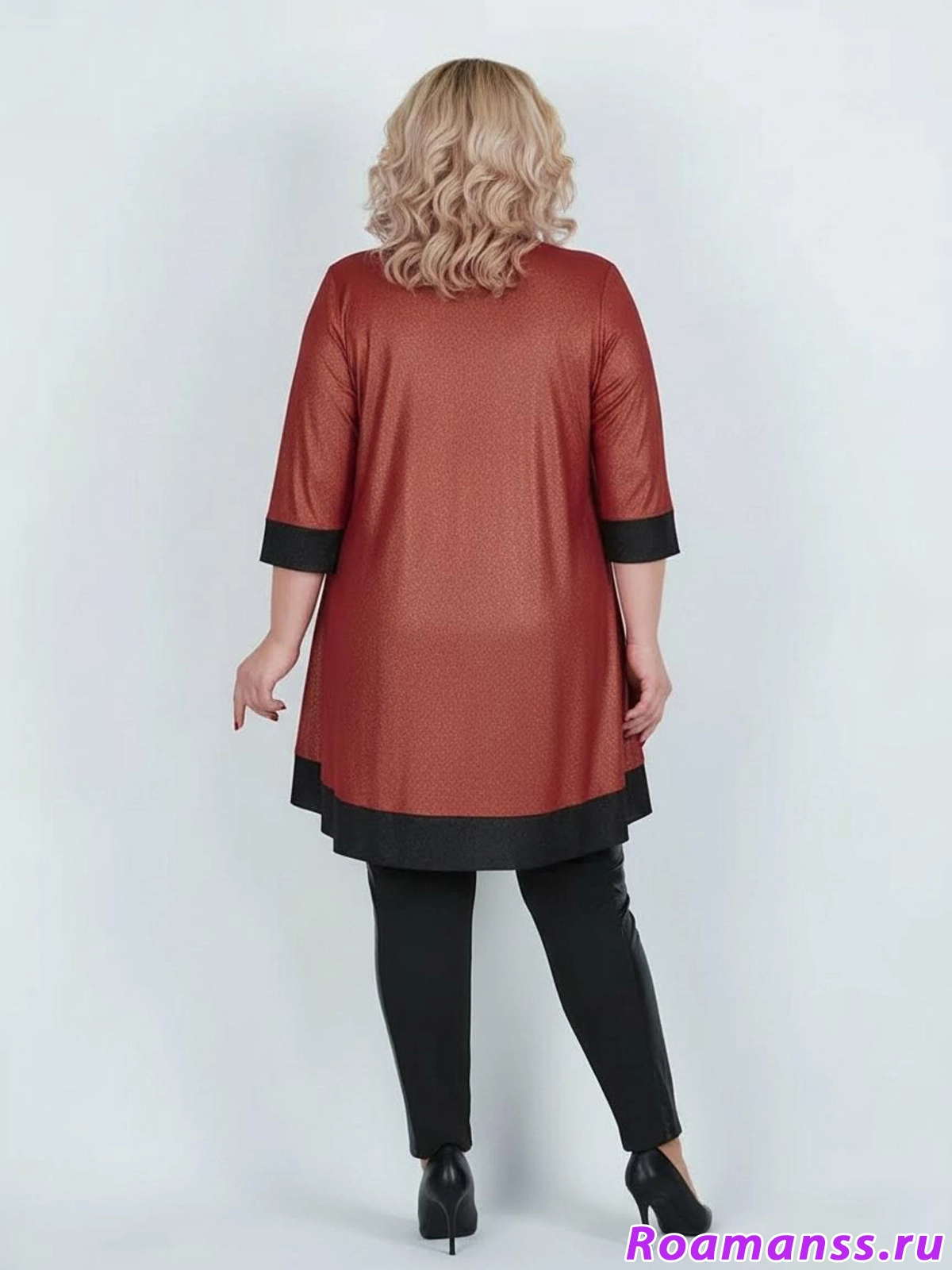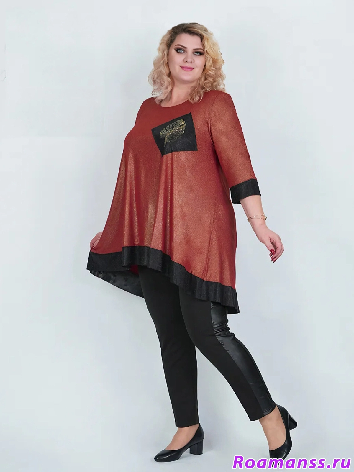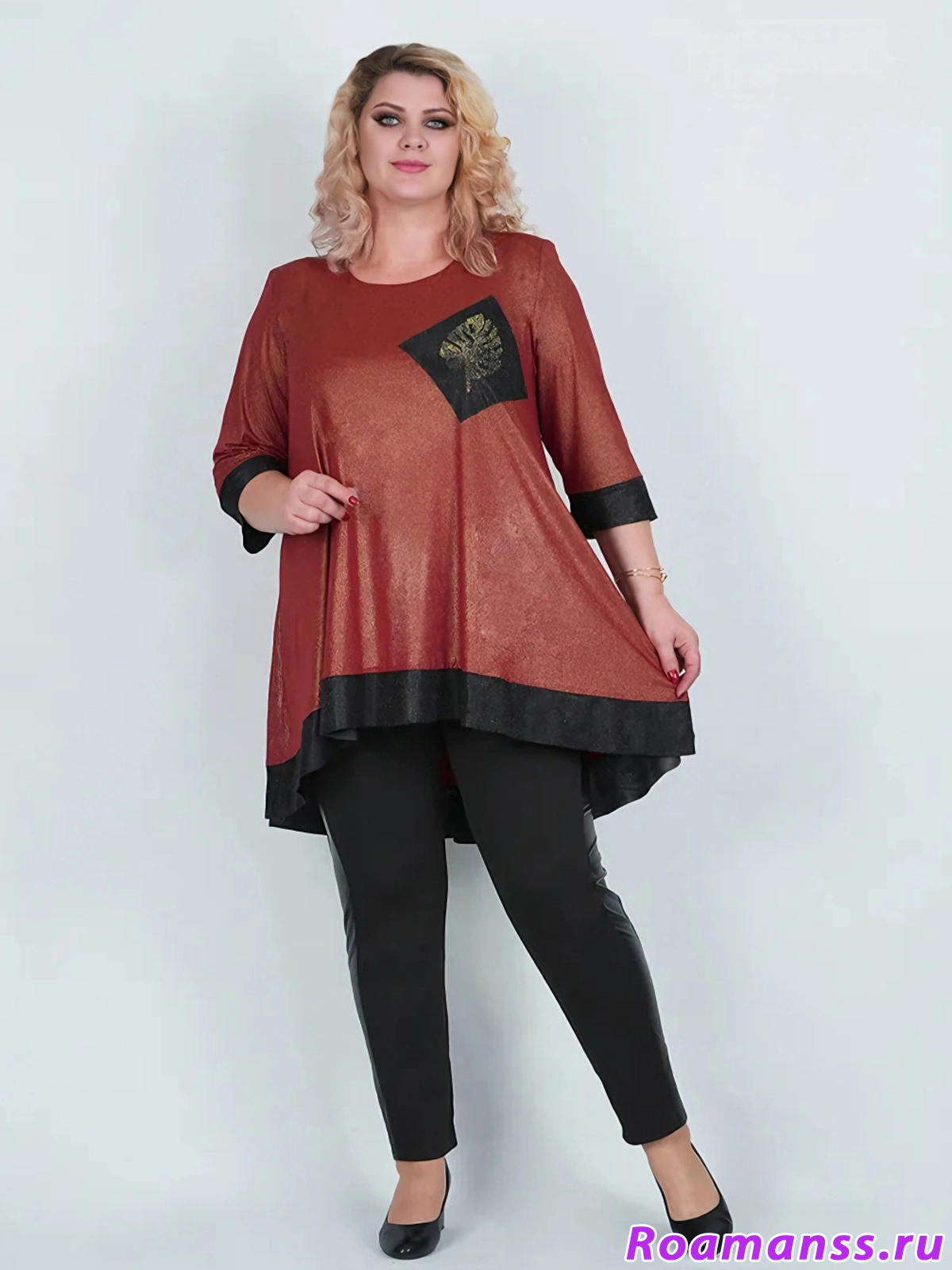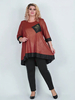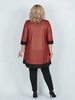 Эффектная туника из трикотажа масло красного цвета с золотистым напылением. Фасон расклешён. Украшена чёрными вставками и аппликацией из страз. Длина 96см.