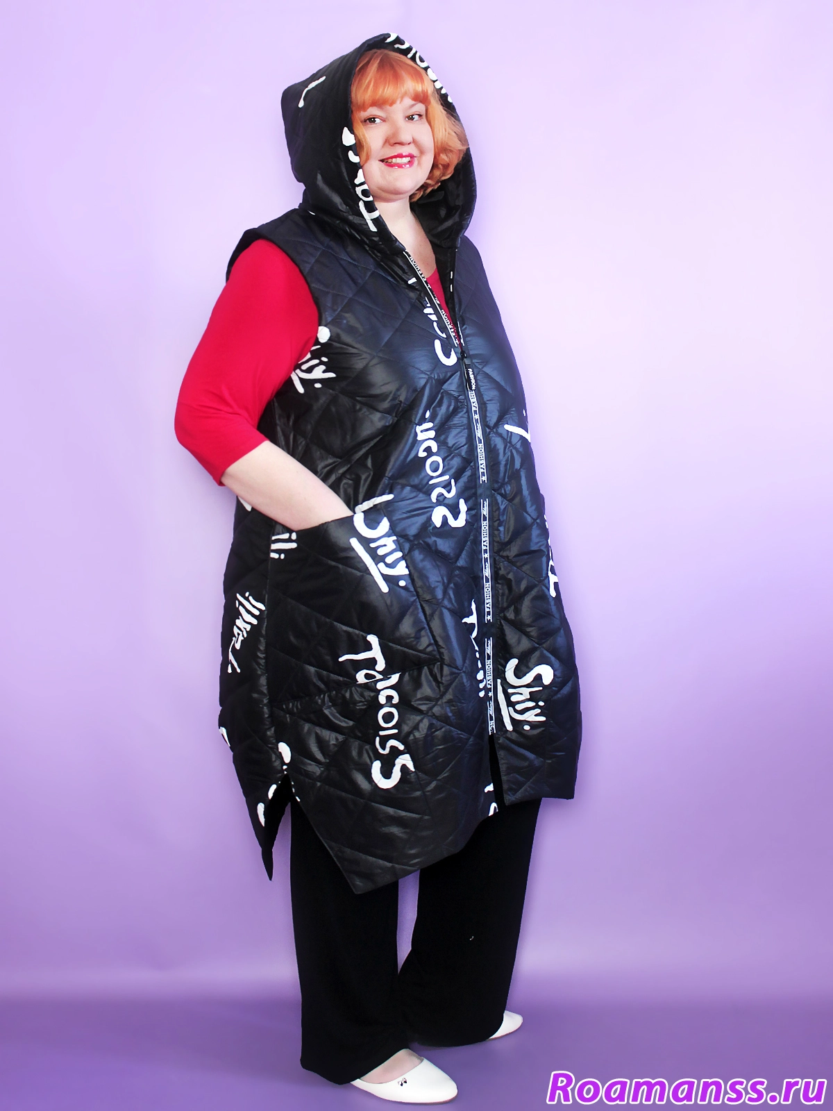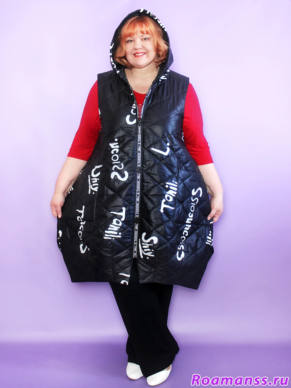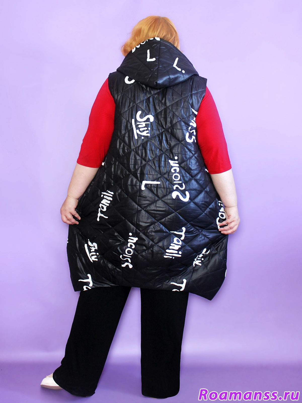 Стильный утеплённый жилет чёрного цвета с капюшоном. Модель удлинённая, расклешённого кроя, застёгивается на молнию. По всей поверхности жилета оригинальный принт с белыми буквами, что добавляет образу современности и индивидуальности. Жилет выполнен из лёгкой стёганой ткани, отлично держит тепло и защищает от ветра. Два вместительных накладных кармана делают модель ещё более практичной. Идеальный вариант для прогулок и активного отдыха в прохладную погоду. Длина 105см.