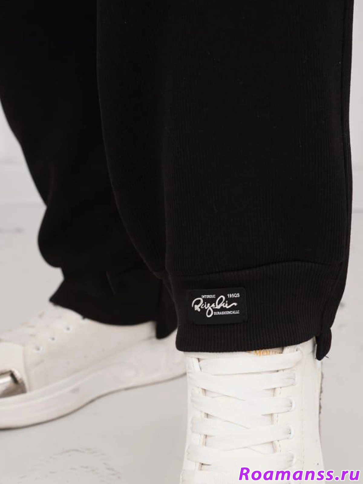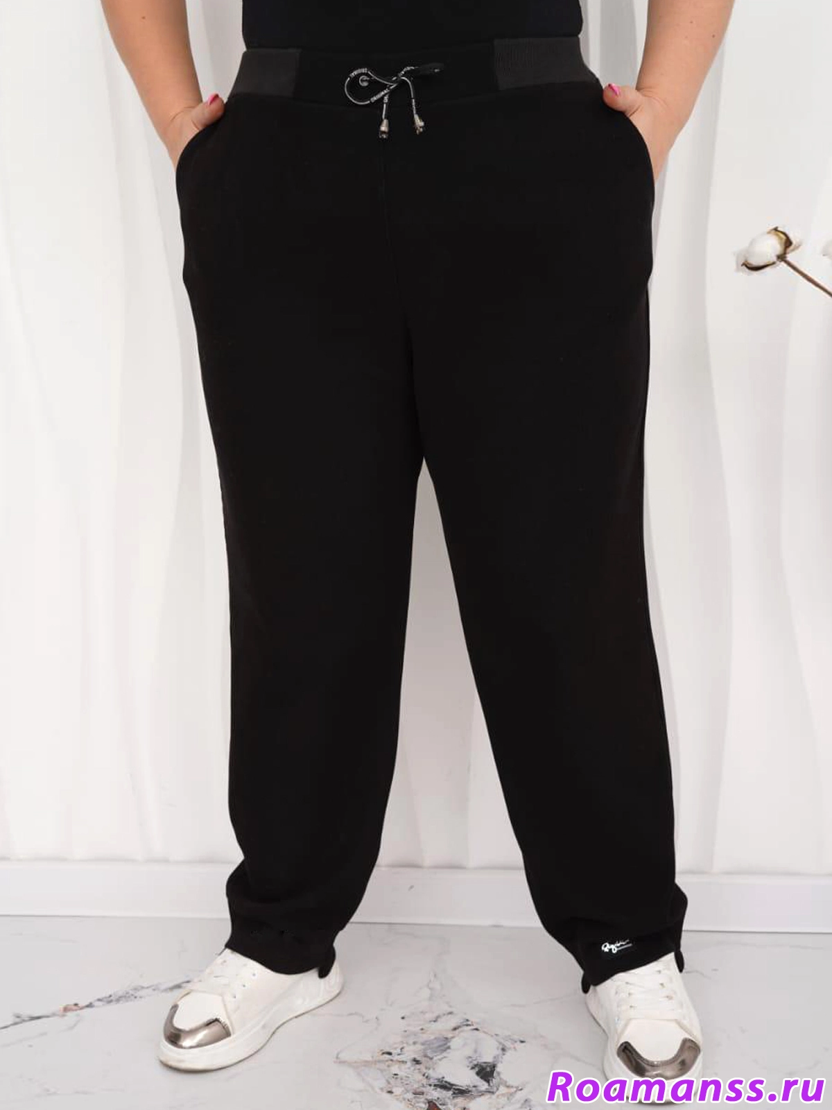 Брюки из плотного трикотажа Нейлон в спортивном стиле. Фасон прямой. Пояс круговая резинка и шнурок. Спереди под поясом карманы. По низу брючины с передней части небольшой подворот и нашивка. Длина спереди 105см сзади 108см. Состав ткани вискоза65%, полиэстер30%, эластан5%
