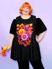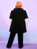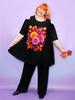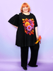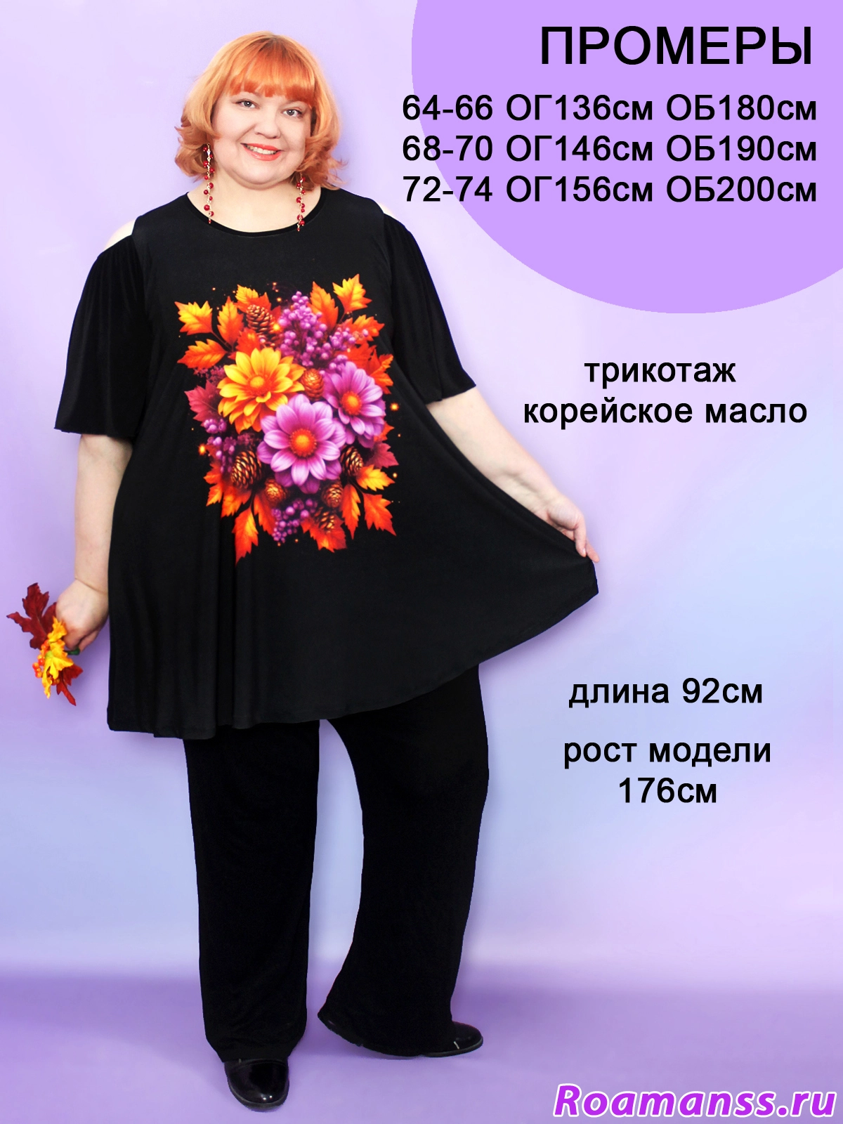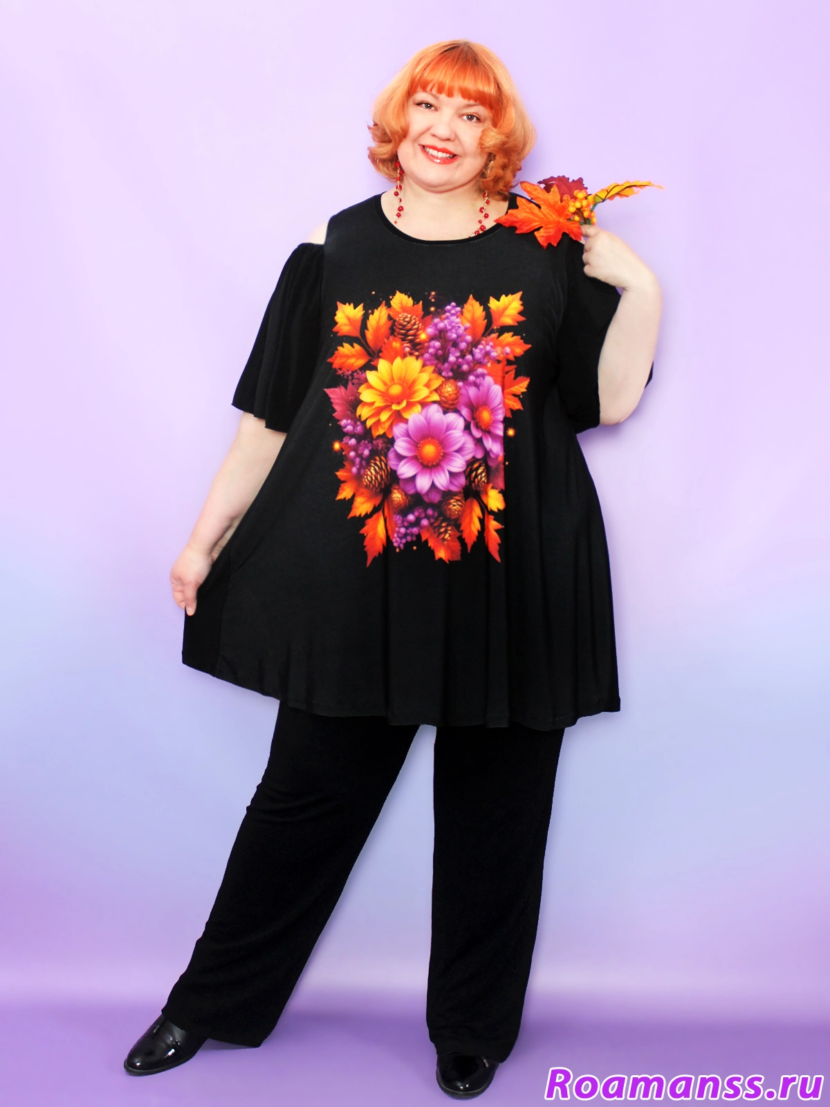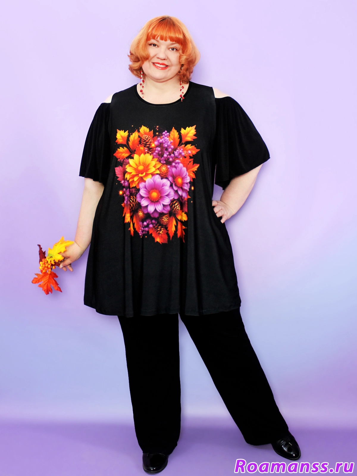 Стильная дизайнерская туника больших размеров для полных женщин. Эта женственная туника выполнена из трикотажа корейское масло. Она идеально садится по фигуре благодаря трапециевидному расклешенному крою. Чёрная основа c ярким авторским принтом визуально стройнит, а рукава-крылышки придают образу легкость и романтичность. Туника комфортна для повседневной носки и создаёт нарядный образ для любого случая - работы, отдыха или встречи с друзьями. Материал приятен к телу, хорошо тянется и красиво струится при движении. Выбирайте красоту и комфорт каждый день!