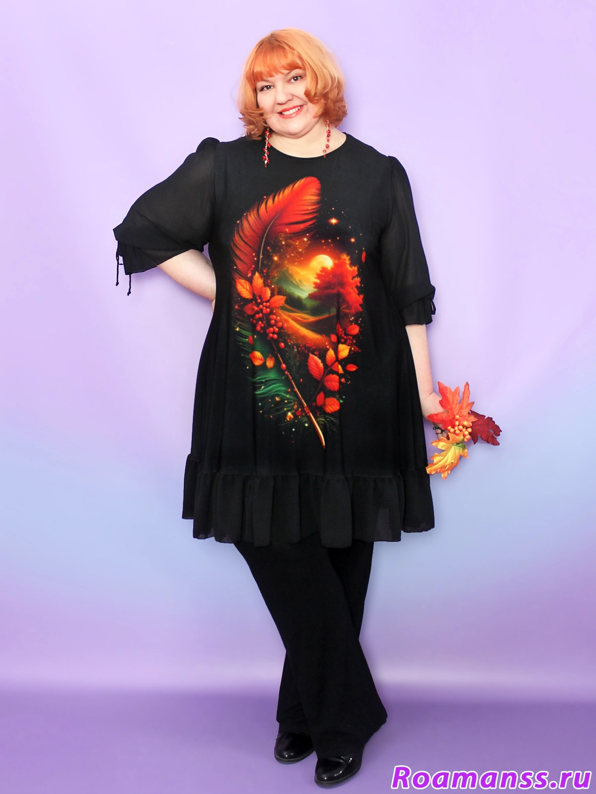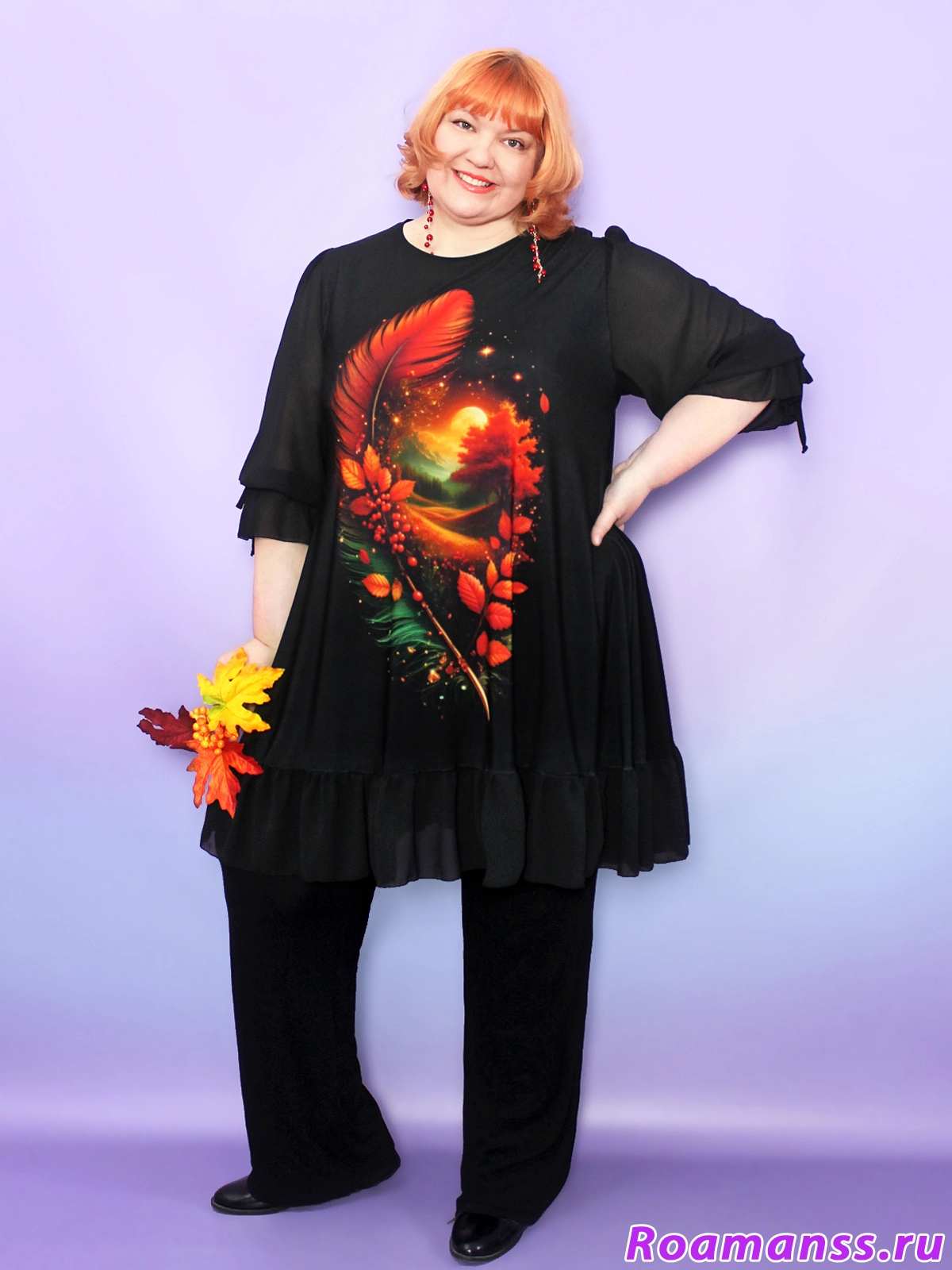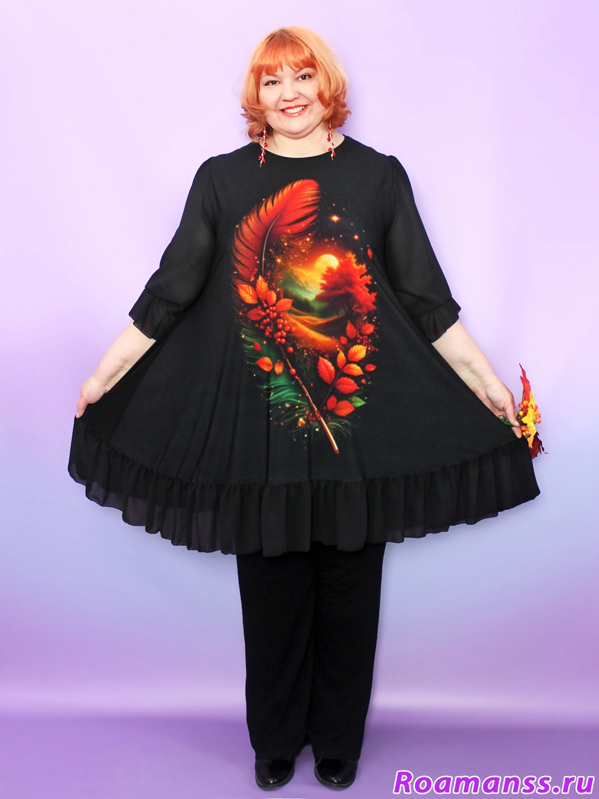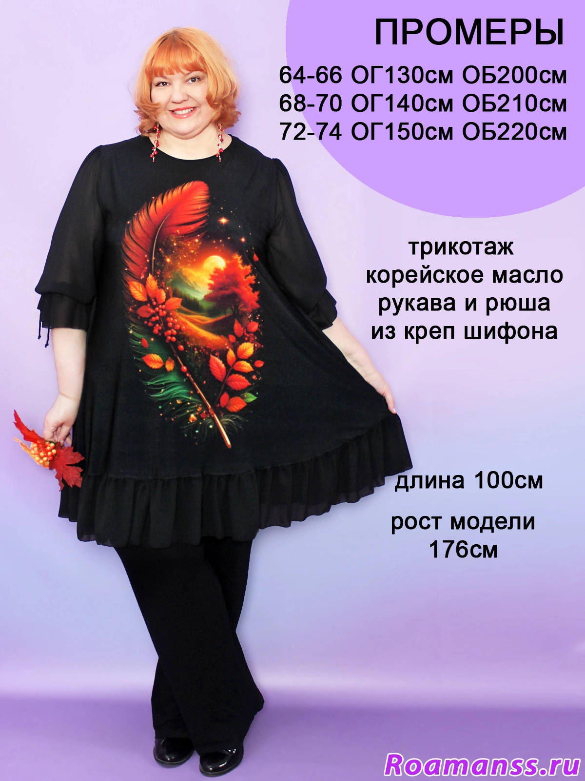 Эффектное платье-туника больших размеров с ярким авторским принтом. Выполнено из трикотажа корейское масло. Легкие рукава-фонарики и рюша из шифона. Фасон сильно расклешен, такой приём позволяет полным дамам чувствовать себя комфортно и женственно. Модель идеальна для полных женщин, за счет ткани и силуэта визуально уменьшает объёмы. Длина 100см.