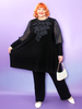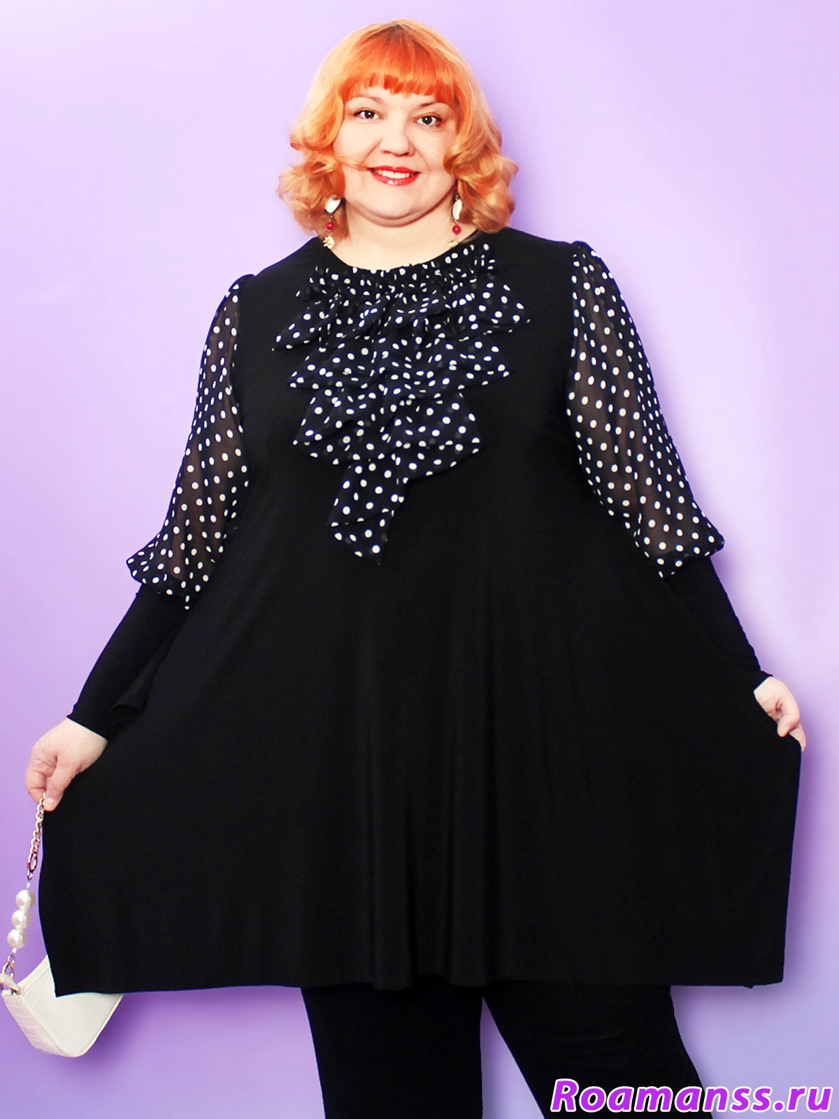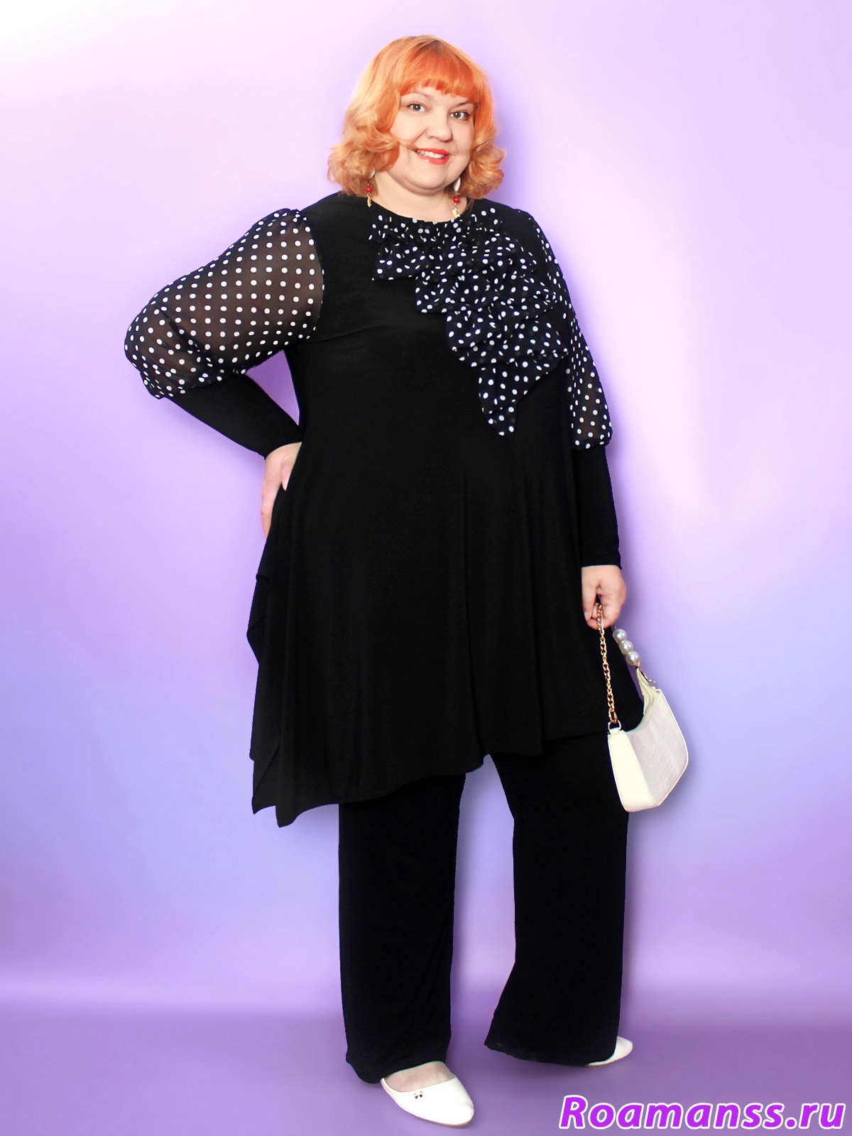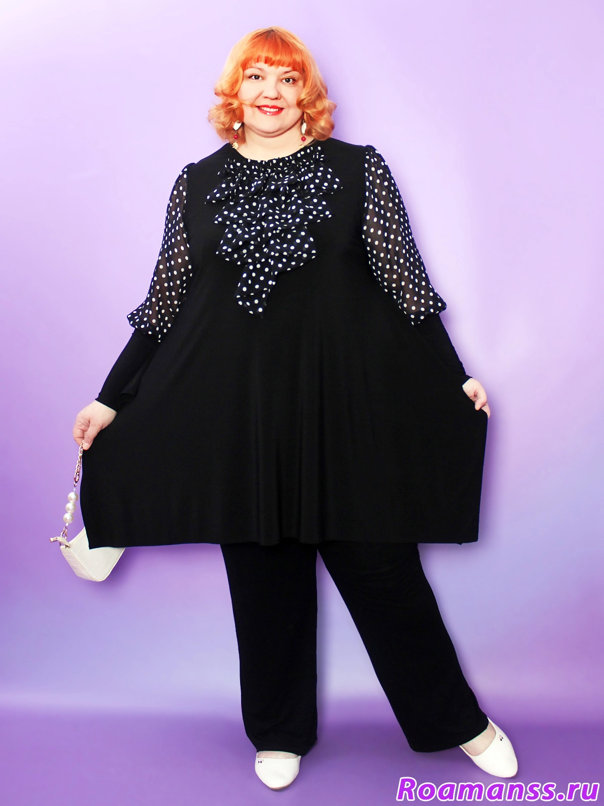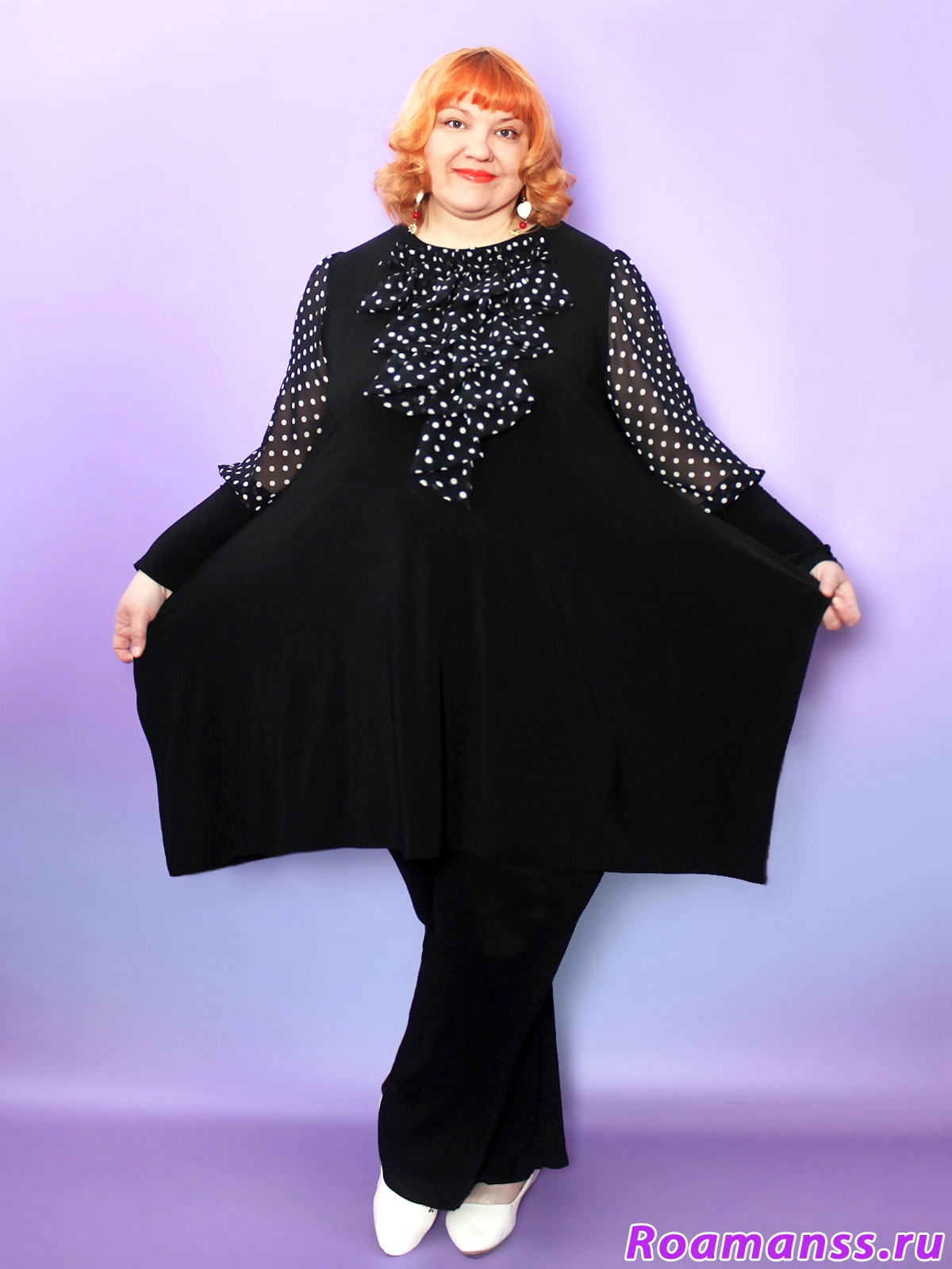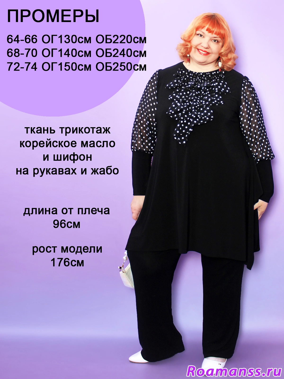 Эта великолепное платье-туника больших размеров воплощает элегантность и женственность! Трикотаж корейское масло дарит мягкость, а воздушные шифоновые рукава-фонарики с изысканным жабо добавляют легкости и изящества вашему образу. Трапециевидный крой и длина от 96 см создают стройный силуэт, тонко подчеркивая достоинства фигуры. Идеальный выбор для торжеств и особых случаев — нарядная туника для полных женщин больших размеров станет центральным элементом вашего гардероба.