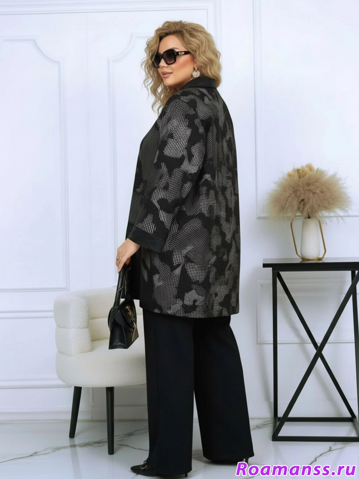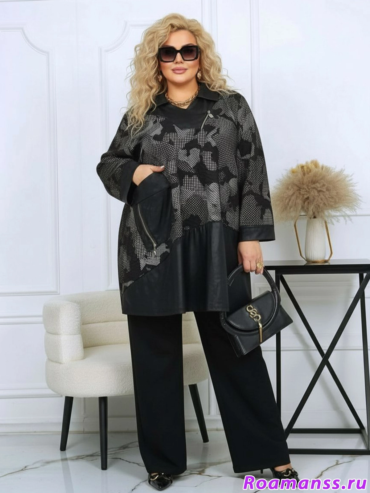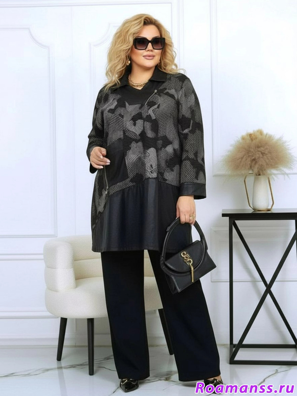 Шикарная туника для прохладного сезона. Выполнена из жаккардового трикотажа со вставками с пропиткой под кожу. Ткань очень приятная к телу, не мнётся, тянется. Украшена декоративными молниями. Фасон расклешен. Длина 88см.