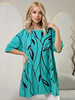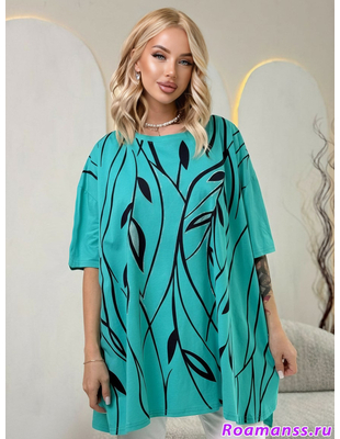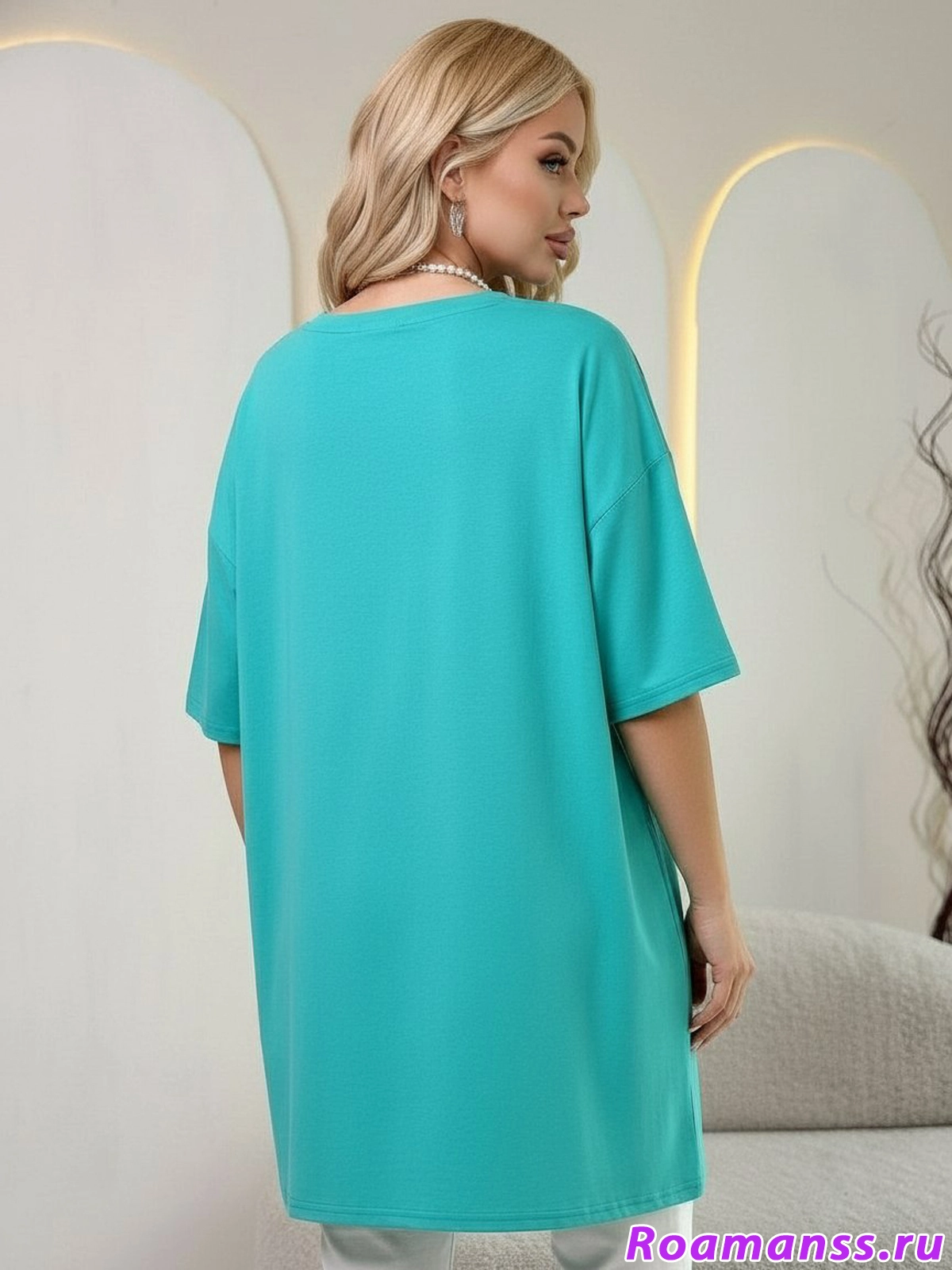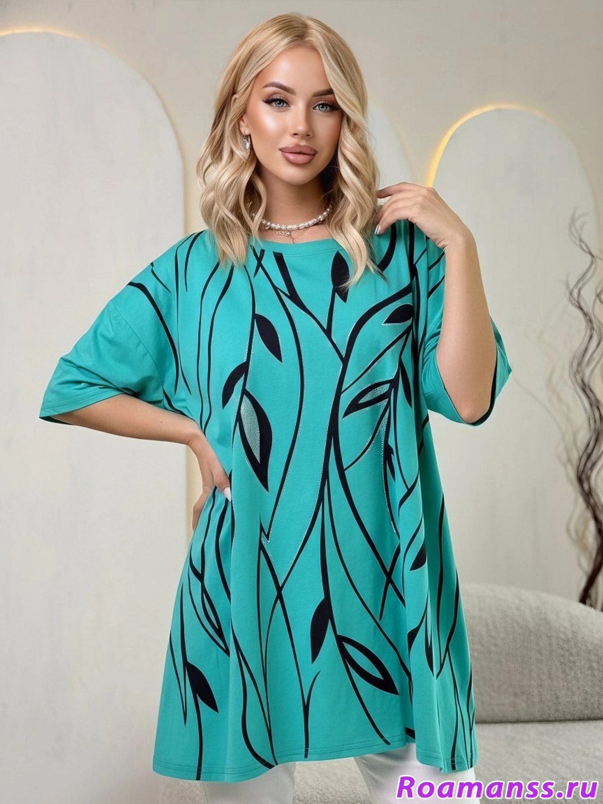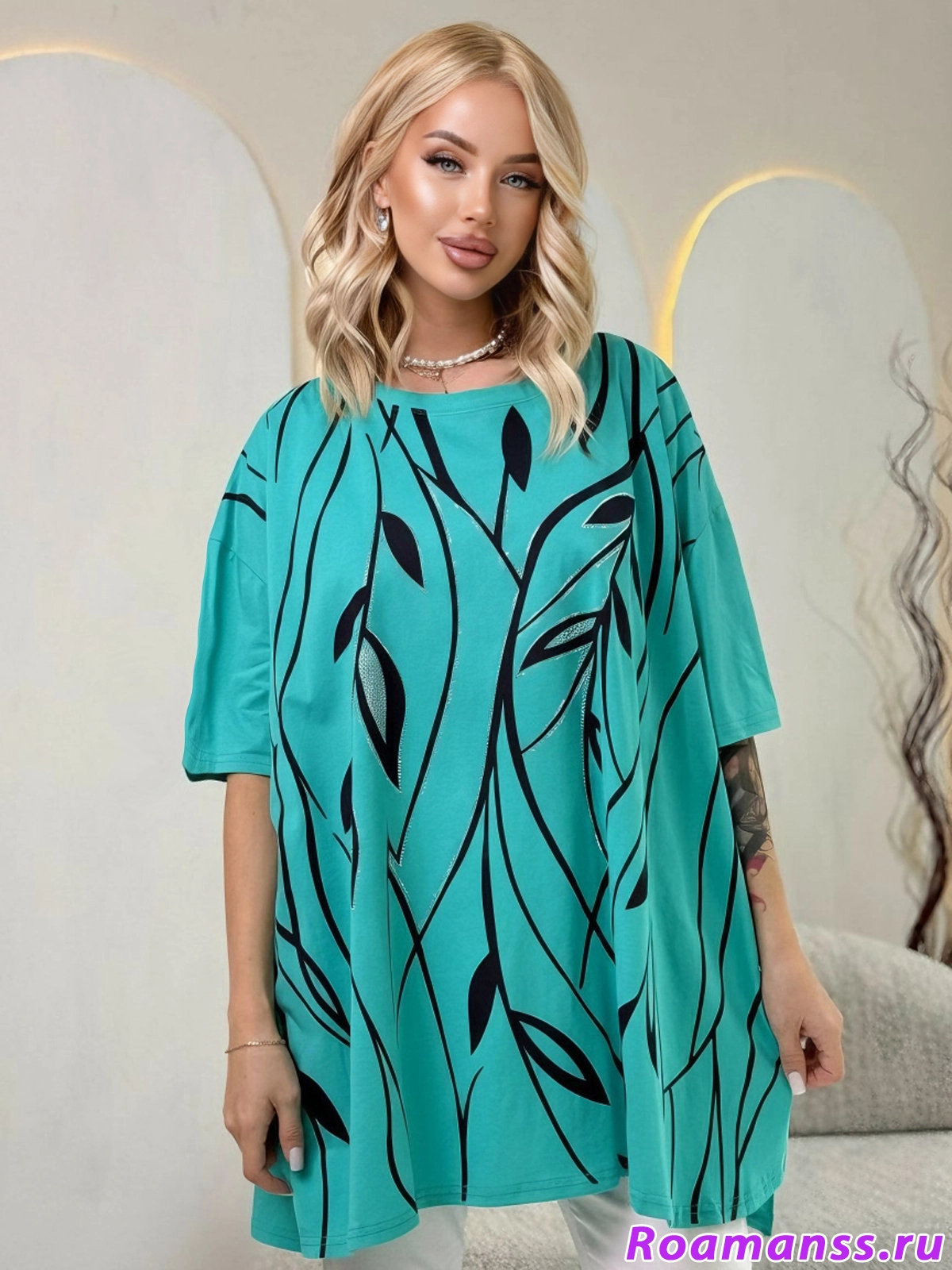 Летняя футболка из хлопкового трикотажа в едином размере. Линия плеча приспущена. Украшена принтом со стразами. Рукава длиною по локототь ширина рукава 50см. Длина 78см.
