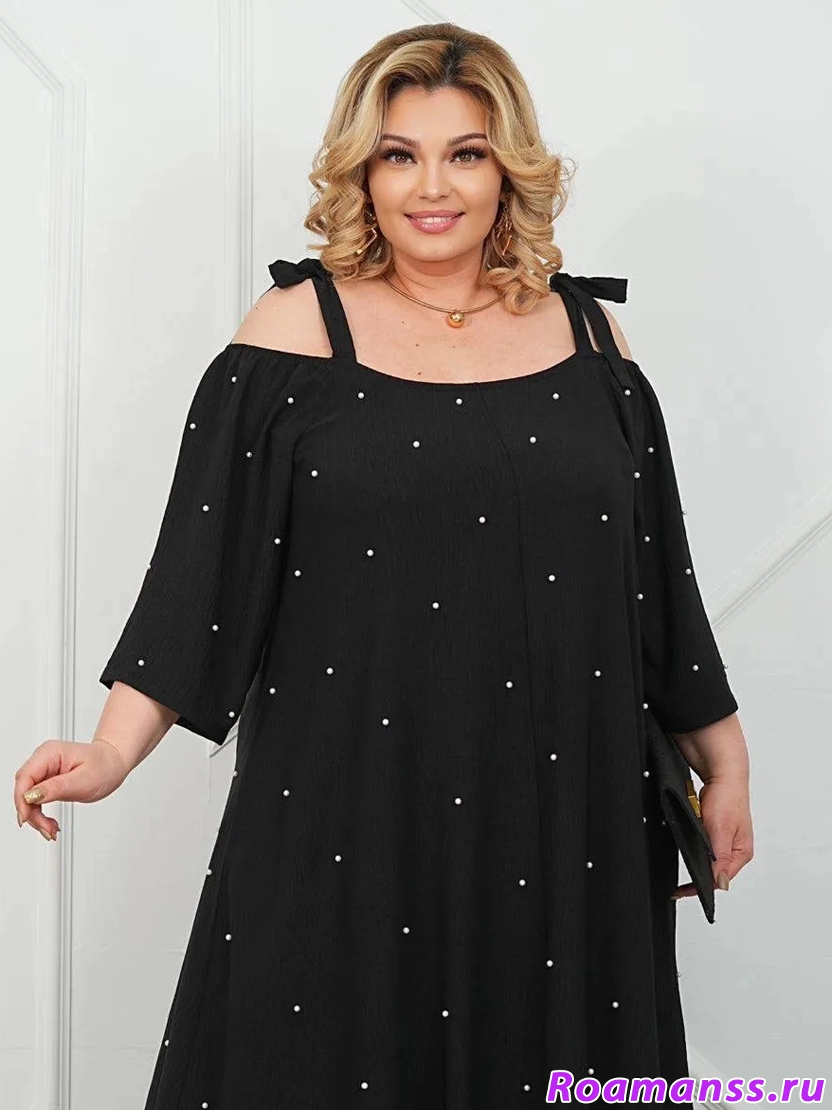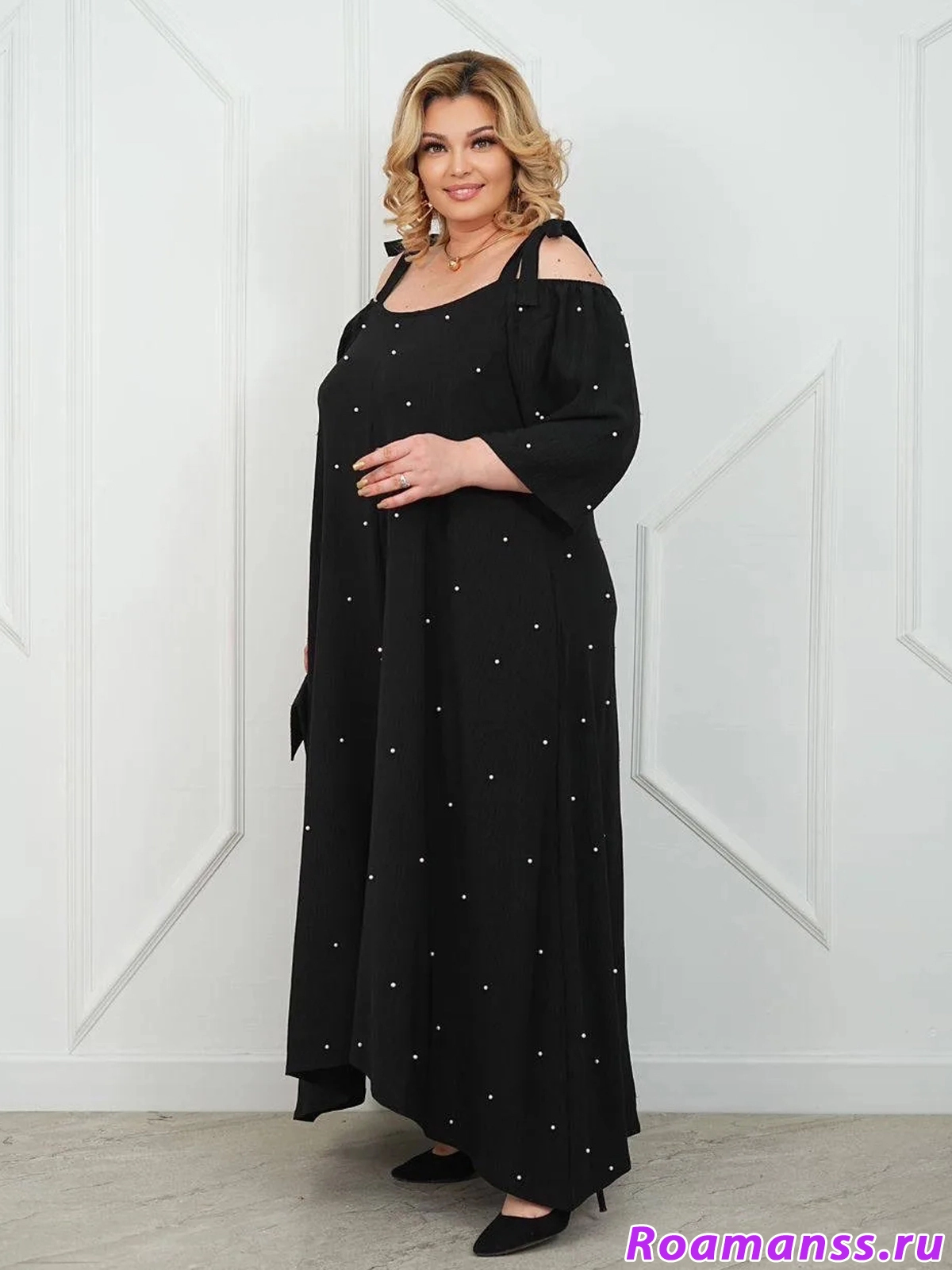Особое очарование платью придают изысканные декоративные элементы: искусственный жемчуг и романтичные банты-завязки на плечах.