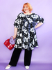 Платье Жасмин Roamanas - это воплощение женственности и уверенности! Уникальный сильно расклешённый крой делает это платье настоящей находкой для дам, которые хотят создать воздушный и легкий образ. Изделие выполнено из качественной гладкой плотной ткани Барби — она приятна к телу, не просвечивает и сохраняет форму даже после многочисленных стирок. Дизайнерский чёрно-белый цветочный принт подчеркнёт вашу индивидуальность и создаёт праздничное настроение. Эластичные резинки на вырезе горловины и рукавах формы реглан позволяют легко адаптировать посадку под индивидуальные особенности, создавая ощущение свободы и комфорта при движении. Универсальная длина 100см подходит на любой рост.