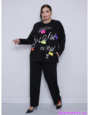 Молодёжный трикотажный костюм с премиальной шелкографией — выглядит дорого и эффектно, идеально смотрится на полной фигуре. Состоит из свитшота и брюк. Свитшот свободного прямого кроя. Линия плеча приспущена. Боковые карманы во швах. Длина 77см. Брюки спортивного прямого кроя с поясом на резинке. Спереди под поясом карманы. Длина 112см.
