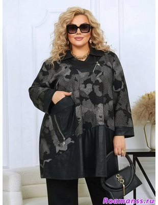 Шикарная туника для прохладного сезона. Выполнена из жаккардового трикотажа со вставками с пропиткой под кожу. Ткань очень приятная к телу, не мнётся, тянется. Украшена декоративными молниями. Фасон расклешен. Длина 88см.