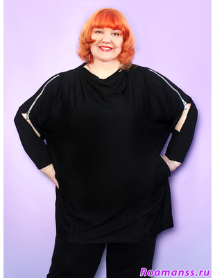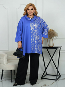 Стильная туника из мягкого утепленного трикотажа. Фасон прямой. Рукава формы летучки. Рукава украшены декоративными молниями. Вырез горловины типа шалька. Спереди прорезные карманы. Длина 87см.